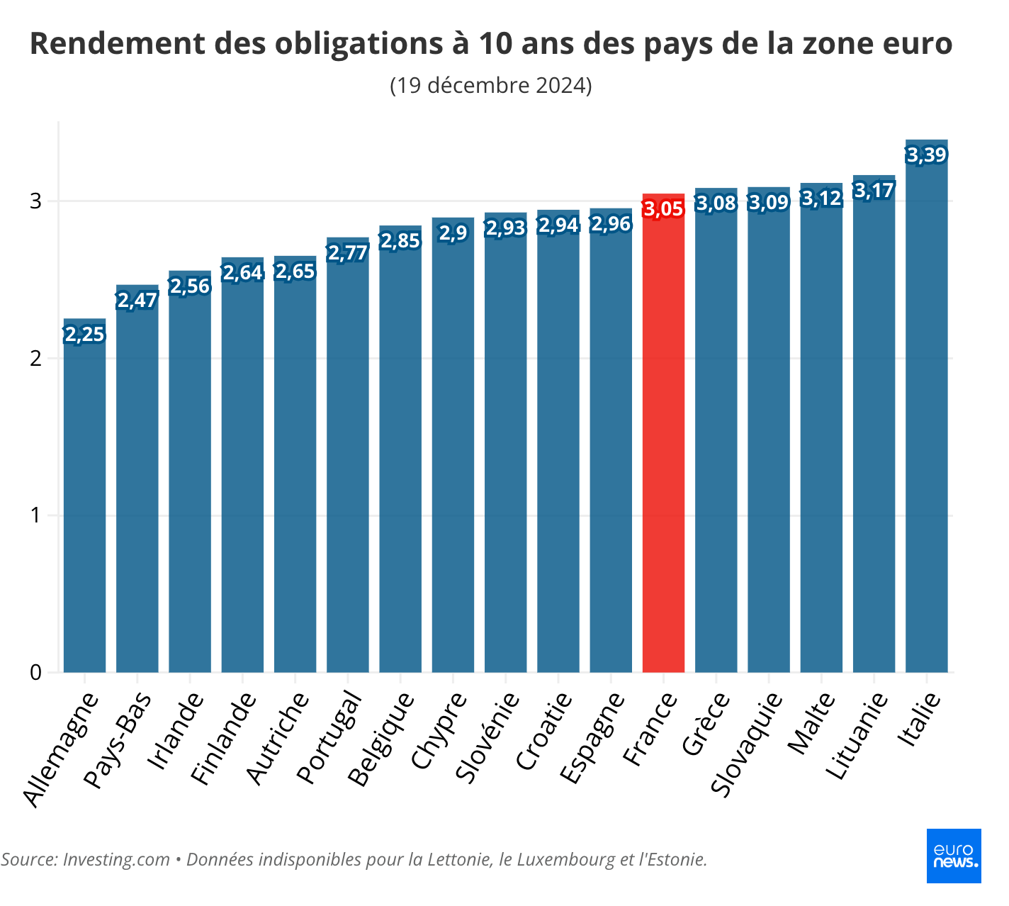 Les rendements des obligations françaises à 10 ans continuent de grimper, ce qui laisse transparaitre une inquiétude croissante des investisseurs pour les finances publiques de la deuxième économie de l'Union européenne. Un contraste frappant avec des pays comme Chypre, l'Espagne ou la Croatie, désormais perçus comme des investissements moins risqués sur le marché obligataire.