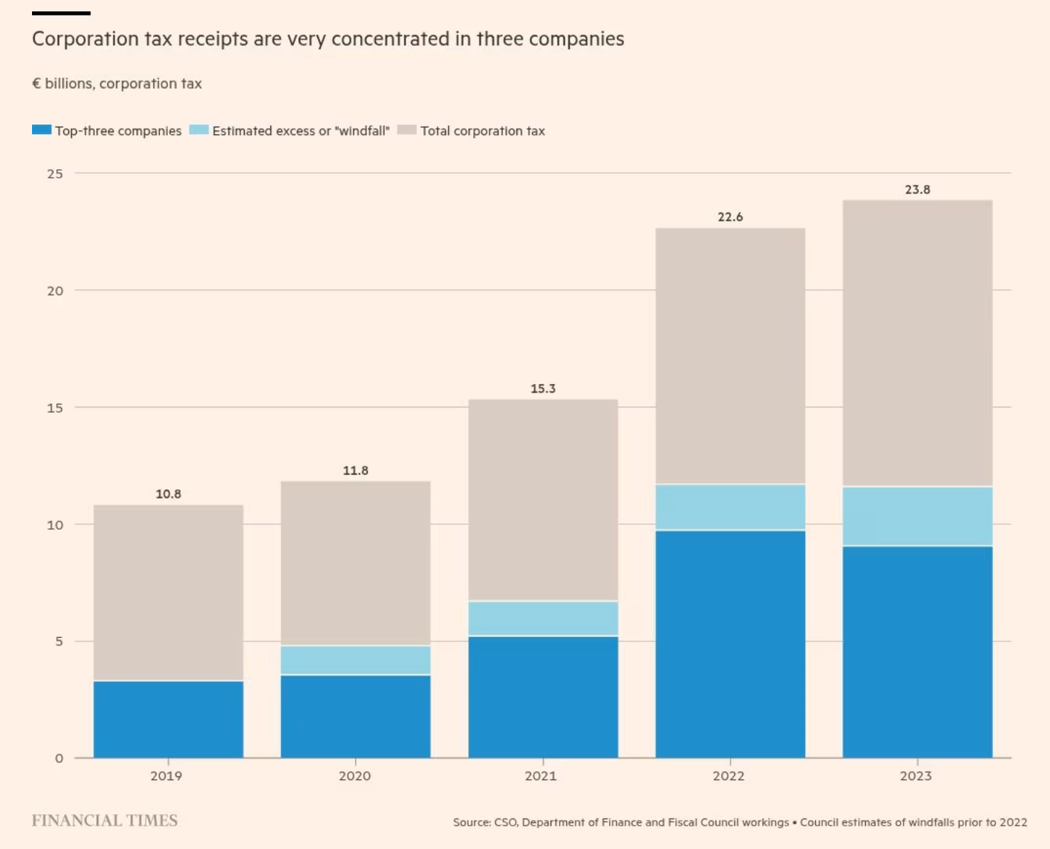 Les recettes de l'impôt sur les sociétés ont presque triplé depuis 2019 et se sont élevées à 35 milliards d'euros de janvier à novembre. Sans l'impôt sur les sociétés, l'Irlande aurait un déficit de 6,3 milliards d'euros par an, selon l'Ifac. À côté de cette politique fiscale, le pays a multiplié les mesures chocs. Baisse du nombre de fonctionnaires de 325 000 en 2009 à 293 000 en 2014. Passage du temps de travail de 35h à 39h pour certains postes. Baisse de la rémunération jusqu’à 20% dans la fonction publique et le nombre d’élus a baissé de 40%, division par 4 du nombre de collectivités locales (114 à 31) entre 2009 et 2014. Les aides sociales sont gelées pendant 2 ans entre 2009 et 2011 et celles pour ceux de moins de 20 ans divisées par deux. Finalement, grâce en partie à ces mesures, le pays a réussi à faire passer sa dette publique de 120% de son PIB en 2013 à 43% en 2023, et même repasser en excédent budgétaire.