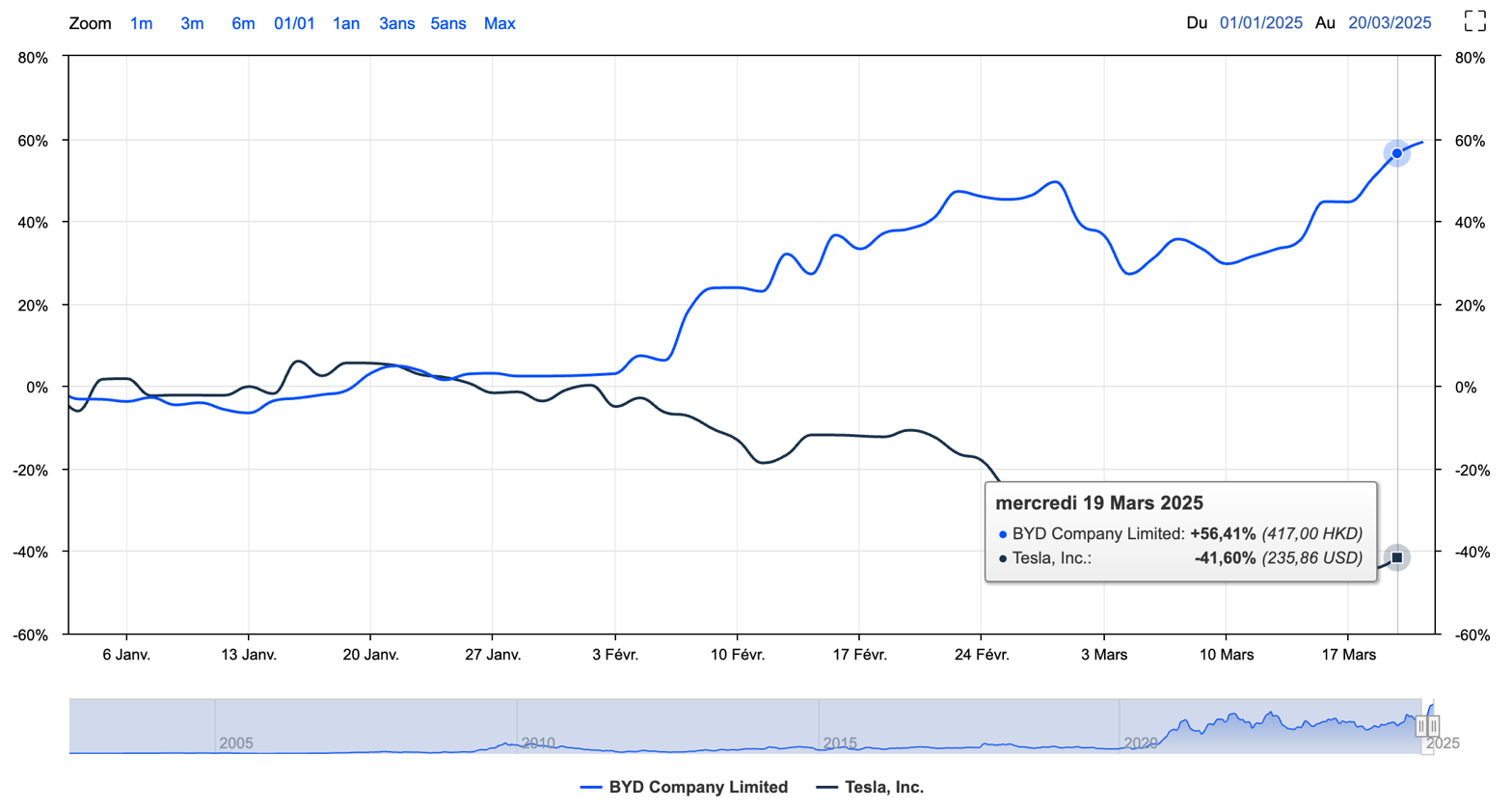 Baptisé "Super e-Platform", le nouveau système présenté par BYD lundi soir promet une prouesse inédite : une charge de pointe à 1 000 kW, permettant à certains véhicules de récupérer plus de 400 km d'autonomie en 5 minutes de recharge, soit à peu près le temps d’un plein d’essence à la station service, c’est d’ailleur ce qu’a déclaré le patron de BYD : “Notre objectif est de faire en sorte que le temps de charge des véhicules électriques soit aussi court que celui des véhicules thermiques”. A titre de comparaison, Tesla utilise un système à 400 volts offrant une puissance de recharge maximale de 250 kW pour la plupart de ses modèles. BYD a présenté la “Super e-Platform” en même temps que deux nouveaux modèles de véhicules électriques qui seront les premiers à être équipés du système : la berline Han L et le SUV Tang L. L’entreprise dont le siège est à Shenzhen a dévoilé un plan pour construire plus de 4000 stations de charge ultra rapide en Chine. Cette expansion fait suite à une croissance impressionnante, les ventes de février ayant grimpé de 161% pour atteindre plus de 318.000 véhicules électriques et le cours de l’action de BYD est en hausse de plus de 50% depuis le 1er janvier. Pendant ce temps, Tesla a vu ses ventes chuter de 49% sur le marché chinois au cours de la même période, et le cours de l’action du constructeur américain est en baisse de plus de 40% depuis le 1er janvier.