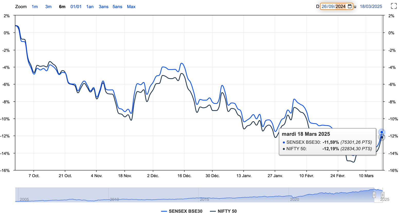 Après avoir atteint un record à presque le 27 septembre dernier, le Sensex, l'indice boursier de référence du pays, a dégringolé de 12 % en 5 mois, tout comme l’indice Nifty 50, qui rassemble les 50 principales capitalisations boursières du pays. Une tendance qui s’explique par plusieurs facteurs : Déjà, ces quatre dernières années, la Bourse indienne a été portée par des profits impressionnants. Le bénéfice par action des entreprises du Nifty 50 a doublé entre 2020 et 2024, mais ces 5 derniers mois, plusieurs grosses entreprises indiennes ont annoncé des bénéfices moins bons que prévu, sur fond de ralentissement de la demande intérieure et de coûts de production en hausse. Typiquement, le bureau nationale des statistiques (NSO) indien a prévu une croissance du PIB de 6,4 % pour l'année fiscale se terminant en mars 2025, soit le taux le plus bas depuis quatre ans, en raison d'un affaiblissement du secteur manufacturier et d'un ralentissement des investissements des entreprises. Par ailleurs, la victoire de Donald Trump à la présidentielle américaine au mois de novembre a aggravé la situation avec la hausse du dollar et du rendement des obligations américaines à 10 ans. Généralement, les investisseurs se ruent sur les marchés émergents pour obtenir des taux de rendement élevés. Une stratégie qui perd de son intérêt lorsque les obligations américaines, des actifs plus sûrs que les actions indiennes, offrent subitement des rendements élevés. Ces facteurs contribuent à faire fuir les investisseurs. Au mois d'octobre, les investisseurs étrangers ont vendu pour 10,4 milliards d'euros d'actions et d'obligations indiennes, puis 2,4 milliards d'euros en novembre et 7,8 milliards d’euros en janvier.