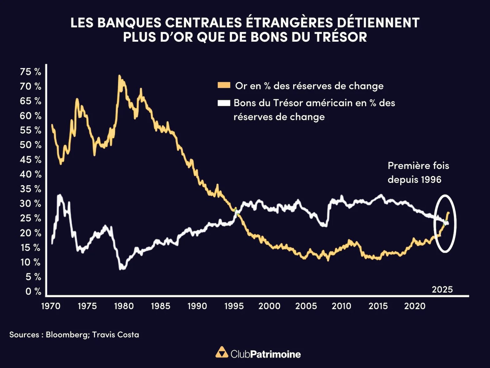 Depuis le 1er janvier, lâor sâest envolĂ© de plus de 50 %, atteignant plus de 4 000 dollars lâonce (31,10 g), tandis que le bitcoin progresse de 32 % pour se nĂ©gocier autour de 125 000 dollars. ConcrĂštement, un lingot dâun kilo dâor, valorisĂ© Ă environ 127 000 dollars, Ă©quivaut dĂ©sormais Ă peu prĂšs Ă un bitcoin. Autre fait marquant : les banques centrales dĂ©tiennent dĂ©sormais davantage dâor que de bons du TrĂ©sor amĂ©ricain, une premiĂšre depuis 1996. Pour rappel, une obligation du TrĂ©sor amĂ©ricain (U.S. Treasury) correspond Ă un prĂȘt accordĂ© au gouvernement fĂ©dĂ©ral par des investisseurs â particuliers, banques, fonds obligataires, assureurs ou banques centrales â en Ă©change dâintĂ©rĂȘts rĂ©guliers et du remboursement du capital Ă lâĂ©chĂ©ance (de 1 Ă 30 ans). Actuellement, les rendements sâĂ©lĂšvent Ă environ 3,6 % sur un an et 4,1 % sur dix ans. Selon une Ă©tude de la Banque centrale europĂ©enne, les banques centrales dĂ©tiennent environ 36 000 tonnes dâor, valorisĂ©es Ă 4 500 milliards de dollars, soit prĂšs de 27 % des rĂ©serves mondiales, contre 23 % pour les Treasuries amĂ©ricains. Cette accumulation dâor, amorcĂ©e aprĂšs lâinvasion de lâUkraine par la Russie, sâest accĂ©lĂ©rĂ©e dans un contexte dâincertitude croissante : inflation persistante, doutes sur lâindĂ©pendance de la Fed, tensions gĂ©opolitiques, perspectives de baisse des taux et, dĂ©sormais, paralysie budgĂ©taire aux Ătats-Unis liĂ©e au shutdown. Ces facteurs renforcent lâattrait du mĂ©tal jaune comme valeur refuge. Ă lâinverse, une dĂ©tente gĂ©opolitique et monĂ©taire pourrait freiner ces flux et stabiliser les cours.