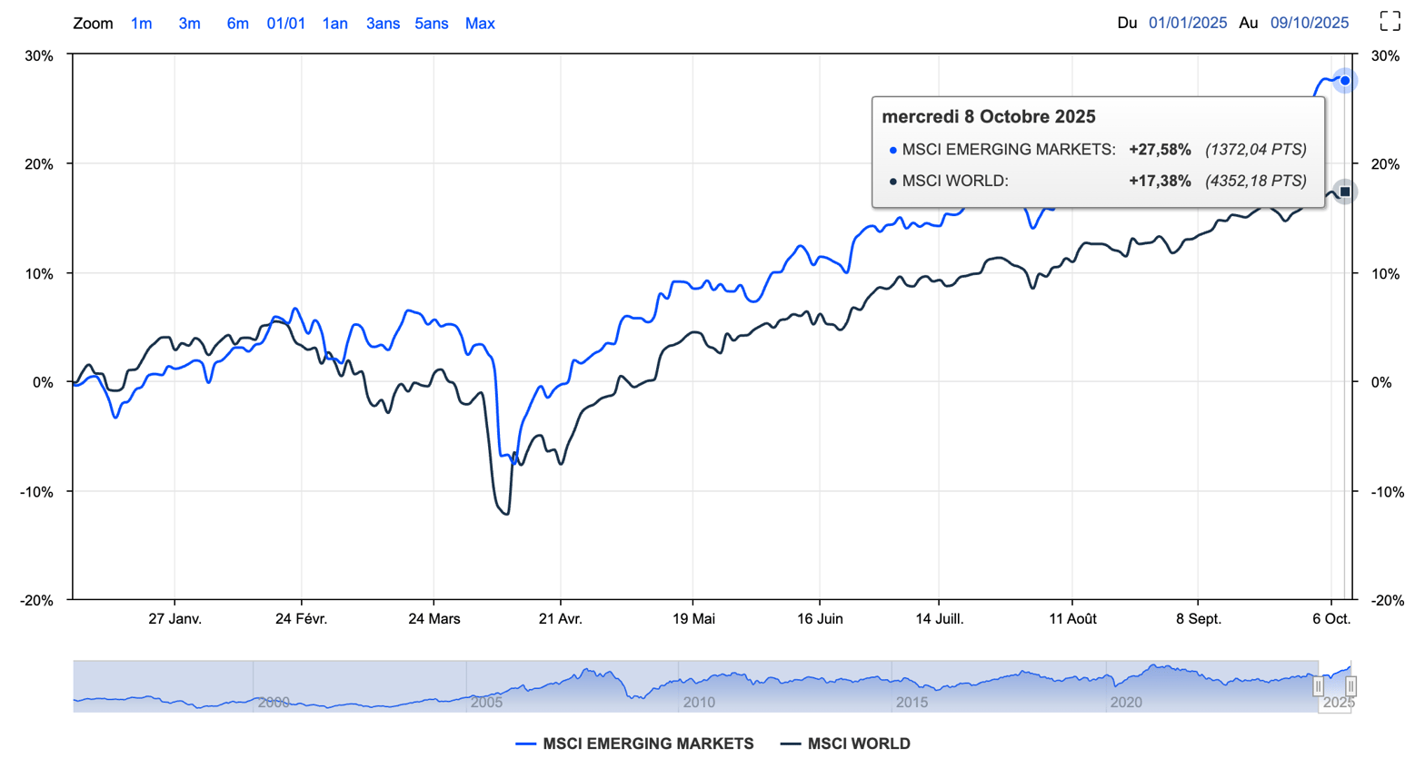LâannĂ©e 2025 consacre un net retournement de tendance : les marchĂ©s Ă©mergents font mieux que les marchĂ©s dĂ©veloppĂ©s. Lâindice MSCI Emerging Markets progresse de plus de 27 % depuis janvier, contre +17 % pour lâindice MSCI World. Pour comprendre cette diffĂ©rence, il faut rappeler la composition de ces deux grands indices. Le MSCI Emerging Markets regroupe 1 189 entreprises cotĂ©es dans 24 pays dits âĂ©mergentsâ, Ă lâexclusion des Ă©conomies dĂ©veloppĂ©es comme les Ătats-Unis, lâEurope ou le Japon. Mais il reste fortement concentrĂ© sur quatre pays : la Chine reprĂ©sente 31 % du poids total, Taiwan 19,5 %, lâInde 15,2 % et la CorĂ©e du Sud prĂšs de 11 %. Ă eux quatre, ils pĂšsent 75 % de lâindice. La concentration est encore plus marquĂ©e au niveau des entreprises : trois sociĂ©tĂ©s totalisent Ă elles seules 20 % du MSCI Emerging Markets â TSMC (10,87 %), Tencent (5,63 %) et Alibaba (4 %). Ce sont prĂ©cisĂ©ment ces valeurs qui ont tirĂ© lâindice vers le haut depuis le dĂ©but de lâannĂ©e : +31 % pour TSMC, +62 % pour Tencent et +113 % pour Alibaba. Ă lâinverse, le MSCI World, censĂ© reprĂ©senter les marchĂ©s dĂ©veloppĂ©s, est encore plus concentrĂ©. Il couvre 1 320 entreprises rĂ©parties dans 23 pays, mais 72,45 % du poids total revient aux Ătats-Unis. Suivent le Japon (5,4 %), le Royaume-Uni (3,5 %), le Canada (3,2 %) et la France (2,6 %). Autrement dit, le MSCI World nâa plus grand-chose de âmondialâ : on pourrait presque le rebaptiser MSCI âUSA & Coâ. Cette surpondĂ©ration se retrouve Ă©galement au sein des entreprises : les dix premiĂšres capitalisations, toutes amĂ©ricaines, reprĂ©sentent Ă elles seules 40 % de lâindice. Une situation qui interroge, car la diversification â principe de base de toute stratĂ©gie dâinvestissement â semble sâĂ©roder dans ces indices de rĂ©fĂ©rence. En 2025, la vĂ©ritable diversification se trouve donc davantage du cĂŽtĂ© des marchĂ©s Ă©mergents.
