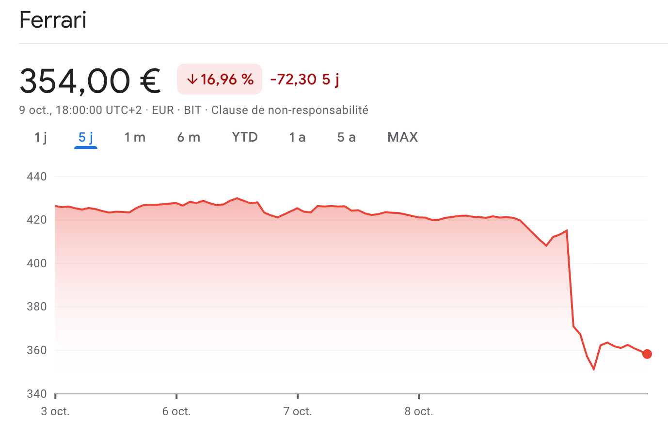 Jeudi, le constructeur italien a connu une sĂ©ance noire en Bourse, la pire depuis son introduction Ă Wall Street en 2015. En cause : la prĂ©sentation de son plan stratĂ©gique Ă lâhorizon 2030, marquĂ© par un net recul des ambitions Ă©lectriques et des prĂ©visions financiĂšres jugĂ©es dĂ©cevantes. Ferrari vise dĂ©sormais Ă ce que seulement 20 % de ses modĂšles soient entiĂšrement Ă©lectriques dâici 2030, contre 40 % annoncĂ©s il y a trois ans. ParallĂšlement, le groupe prĂ©voit un bĂ©nĂ©fice dâexploitation ajustĂ© passant de 2,1 milliards dâeuros en 2025 Ă 2,75 milliards en 2030, alors que les investisseurs tablaient sur 3,2 milliards. MĂȘme constat pour le chiffre dâaffaires, attendu Ă 9 milliards dâeuros dans cinq ans, contre les 10 milliards espĂ©rĂ©s par le marchĂ©. Ces perspectives ont immĂ©diatement Ă©tĂ© sanctionnĂ©es par les investisseurs. Le constructeur a toutefois profitĂ© de cette prĂ©sentation pour dĂ©voiler son tout premier modĂšle 100 % Ă©lectrique, la Ferrari Elettrica, dont les premiĂšres livraisons sont prĂ©vues pour la fin de lâannĂ©e prochaine. Le groupe maintient une stratĂ©gie de âneutralitĂ© technologiqueâ, avec une rĂ©partition cible de 40 % de moteurs thermiques, 40 % dâhybrides et 20 % dâĂ©lectriques dâici 2030. Depuis son introduction en Bourse, Ferrari avait jusquâici dĂ©jouĂ© tous les pronostics : bĂ©nĂ©fice dâexploitation multipliĂ© par quatre, livraisons presque doublĂ©es et objectifs systĂ©matiquement dĂ©passĂ©s. Mais cette fois, le plan prĂ©sentĂ© nâa pas suffi Ă convaincre un marchĂ© habituĂ© Ă des performances sans faute.