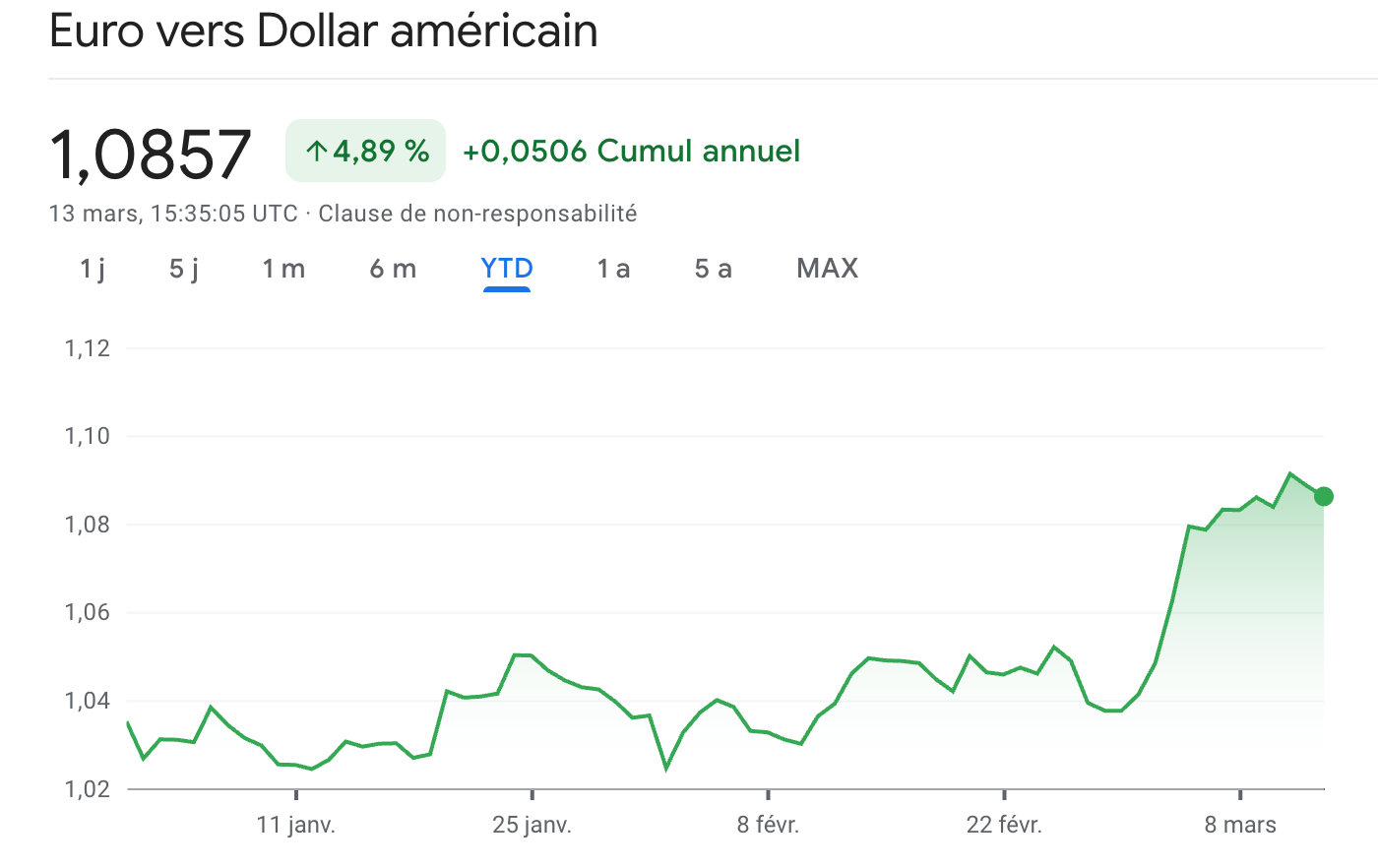La monnaie unique européenne a grimpé de quasiment 5 % depuis le 1er mars pour s’afficher à 1,85 dollar pour 1 euro, c’est-à-dire que l’euro devient de plus en plus fort face au dollar, et cela s’explique par 2 principales raisons : La première est liée à la présentation du plan de la Commission européenne pour “réarmer l'Europe” qui doit permettre de mobiliser quelque 800 milliards d'euros sur quatre ans. Concrètement, les investisseurs s’attendent à ce que ces milliards d’euros soient injectés dans l'économie, notamment dans le secteur de la défense, ce qui devrait stimuler la croissance économique européenne. Dans ce cadre, de nombreux investissements étrangers affluent en Europe pour profiter de cette croissance attendue, ce qui implique donc que ces investisseurs étrangers doivent échanger leurs devises contre des euros pour investir dans le Vieux Continent, ce qui augmente mécaniquement la demande pour la monnaie unique et la fait grimper par rapport à d’autres devises, comme le dollar par exemple. La deuxième raison qui explique l’appréciation de l’euro face au dollar est liée à la situation économique aux États-Unis. Les propos de Donald Trump ce weekend, qui a déclaré qu'il y aurait une période de transition pour l'économie américaine et indiqué qu'il prévoyait toujours de mettre en œuvre de nouvelles hausses de droits de douane dans les mois à venir, ont renforcé les inquiétudes du marché. Un bon nombre d’analystes craignent même une récession économique aux États-Unis, des tendances qui exacerbent un peu plus la méfiance des investisseurs envers le marché américain et donc implicitement envers le dollar américain et réorientent donc leurs capitaux en Europe, ce qui profite à l’euro.
