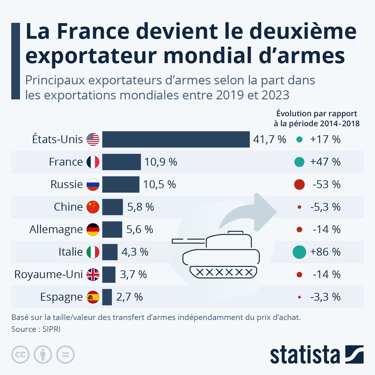 Entre 2019 et 2023, les États-Unis ont représenté 41,7 % du total de la valeur des exportations d'armes dans le monde, la France 10,9 % et la Russie 10,5 %. Cette seconde place pour la France doit beaucoup à l’effondrement des exportations de la Russie, numéro 2 depuis 1950. Avec le conflit en Ukraine, les armes russes sont utilisées principalement par le pays lui-même, et ne partent plus à l’étranger. Cette 2ème place en valeur exportée par la France est aussi due à la vente d’armement très onéreux, avec notamment le rafale, dont le prix tourne autour de 150 millions d’euros l’unité et de sous-marins. Ainsi, sur les 18 milliards d’euros d’armements français vendus en 2024, “près de 10 milliards concernent des plateformes phares comme les Rafale et les sous-marins”, a précisé le ministre des armées Sébastien Lecornu. La France affiche une augmentation d’exportations d’armements en valeur de +47% entre la période 2014-2018 et 2019-2023. La plus grande part des exportations d'armes françaises (42 %) a été destinée à des États d'Asie et d'Océanie, et 34 % à des États du Moyen-Orient. L'Ukraine est devenue le plus grand importateur d'armes européen en 2019-2023 et le 4ème au monde, notamment pour contrer l'invasion russe. Le 3ème plus important importateur était le Qatar sur cette période 2019-2023, en 2ème il s’agissait de l’Arabie Saoudite et l’Inde trônait en tant que plus gros importateur d’armes au monde sur cette période, selon le très sérieux Stockholm International Peace Research Institute (Sipri).