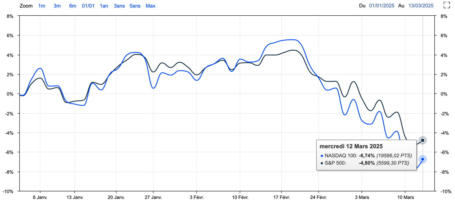 -3,8% ce lundi pour l’indice boursier américain Nasdaq 100, c’est-à-dire l’indice des valeurs technologiques américaines, c’est tout simplement la pire séance boursière depuis 2022 pour l’indice. Sur une seule journée, les valeurs de la tech ont fortement baissé comme Tesla qui a chuté de 15,43%, Meta a reculé de 4,42%, Microsoft de 3,34%, Alphabet de 4,60%, Apple de 4,85%, Amazon de 2,36% et Nvidia de 5,07%. Cette baisse journalière s’inscrit dans une tendance baissière de fond depuis plusieurs semaines, le Nasdaq 100 recule de quasiment 7% depuis le début de l’année et le S&P500 de plus de 4,5%.